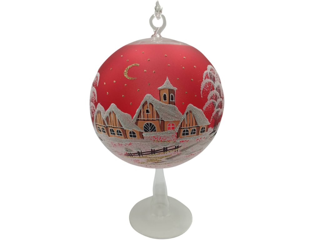 Skleněný lampion na svíčku ručně malovaný s motivem zasněženého kostelíka a chaloupek, průměr 15 cm. Vhodný na čajovou svíčku.